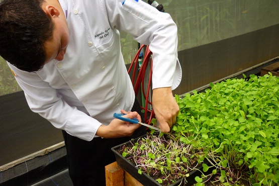 Chef Alejandro Torres, cutting Microgreens, Parador Resort and Spa, Costa Rica, greens