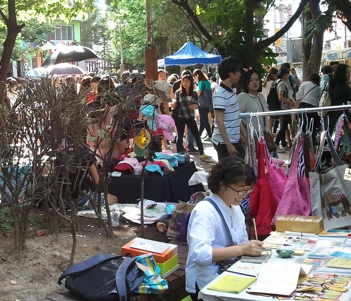 I went for a walk there last Sunday, met my great Korean friend and we went to the Flea Market. Every week-end, art students, artists, artisans and various sellers come together in this little square and showcase their best artwork or products.